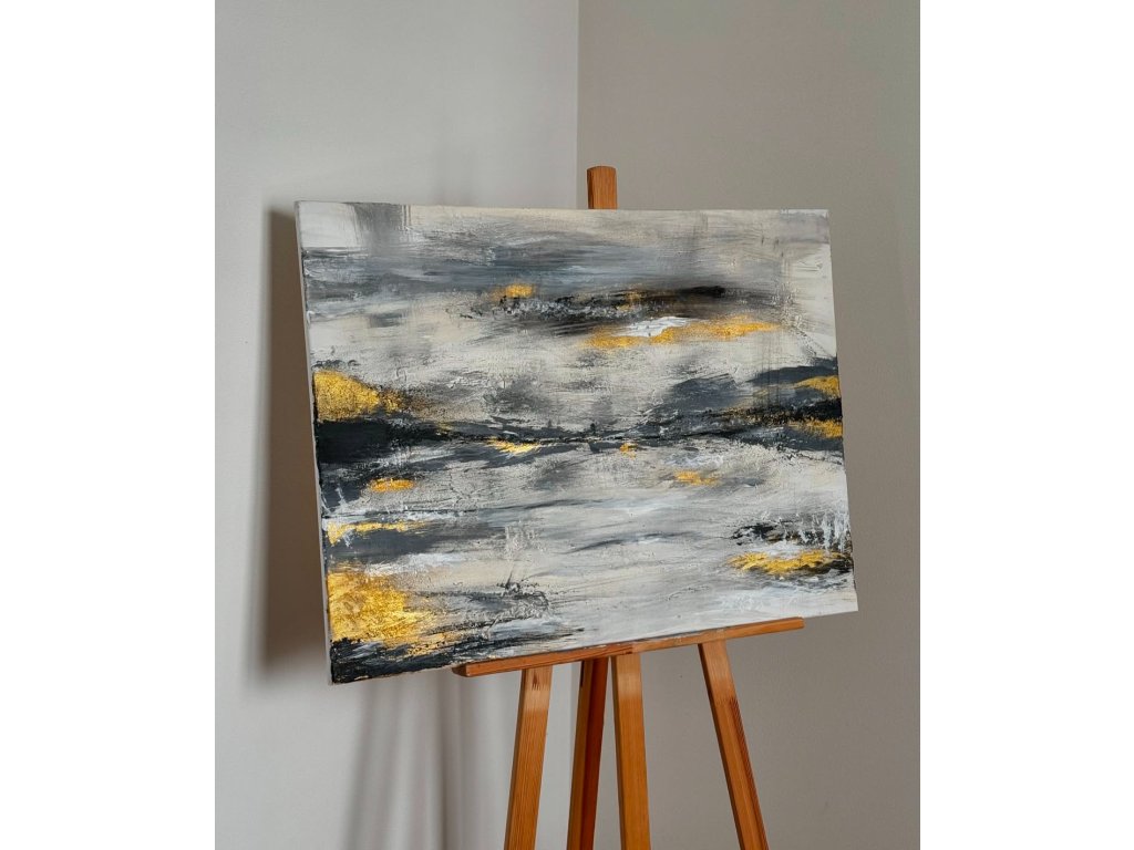 Kde končí nebe a začíná peklo? Tento abstraktní obraz vás vtáhne do světa kontrastů – klidné tóny šedé a bílé se střetávají s temnými bouřkovými mraky a zlatými záblesky naděje. Nechává prostor pro vlastní interpretaci – je to krajina duše, nekonečný horizont nebo abstraktní příběh o cestě mezi světlem a tmou?